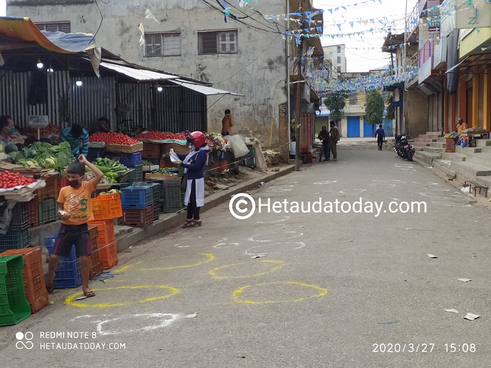 चैत्र १४ हेटौंडा / आज हेटौंडा ४ खोपेगल्लिमा १-१ मिटरको दुरीमा गोलो घेरा लगाईएको छ। अब तरकारी किन्न जाँदा हरेक व्यक्ति एउटा गोलो घेरा भित्र बसेर लाइन लगाएर खरिद गर्नुपर्नेछ।