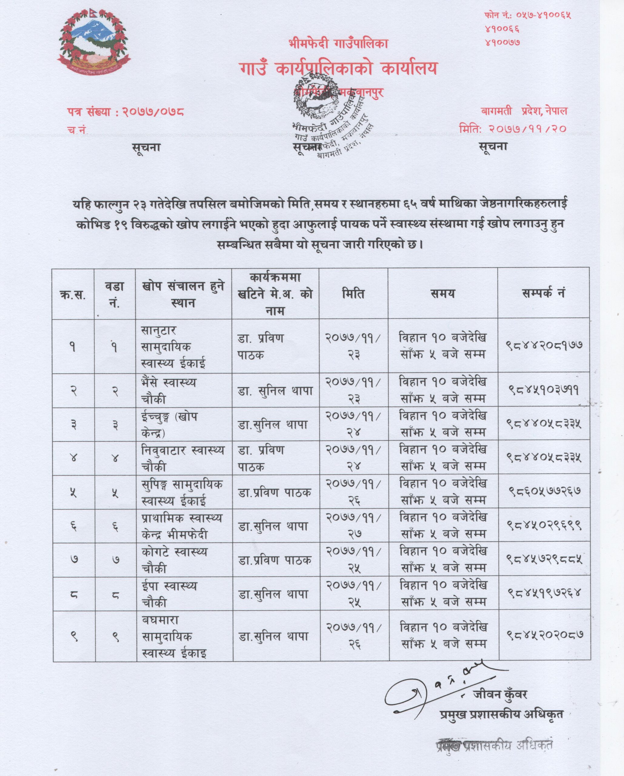 यहि फागुन २३ गते वडा नं १ र २ को सानुटार सामुदायिक स्वास्थ्य ईकाइ र भैसे स्वास्थ्य ईकाइ , त्यसैगरि २४ गते वडा नं ३ र ४ को ईच्चुन खोप केन्द्र निवुवाटार स्वास्थ्य चौकि , त्यसैगरि २५ गते वडा नं ७ र ८ कोगटे स्वास्थ्य चौकी र ईपा स्वास्थ्य चौकी , र आमभन्ञ्यान सामरि स्वास्थ्य चौकीमा, २६ गते वडा नं ५ र ९ सुपिन सामुदायिक स्वास्थ्य ईकाइ डुम्रेकुना साथै बाघमारा सामुदायिक स्वास्थ्य ईकाइ र २७ गते वडा नं ६ प्राथामिक स्वास्थ्य केन्द्र भीमफेदि मार्फत खोप लगाउने तालिका रहेको छ ।