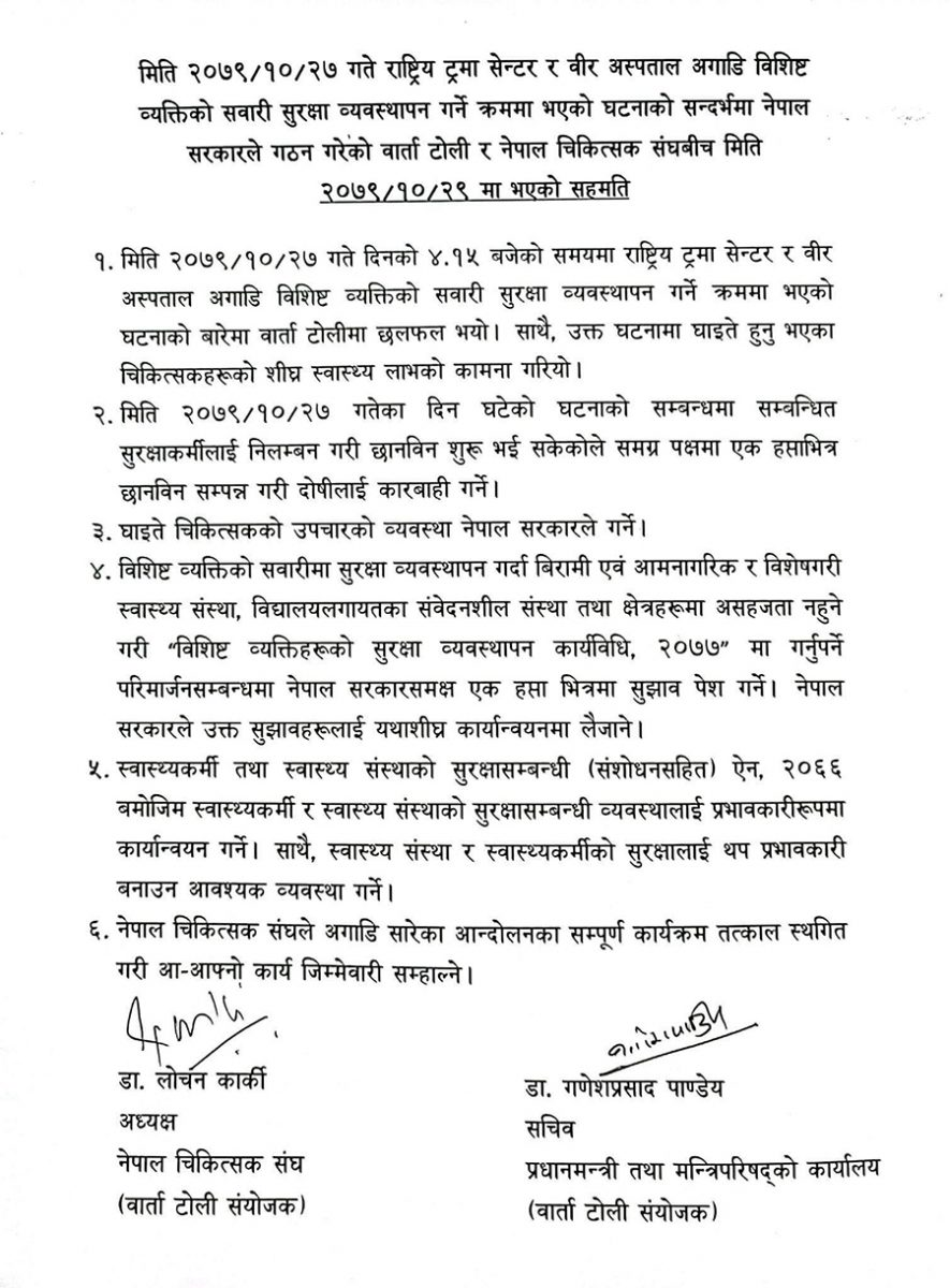 सरकारले घाइते चिकित्सकको उपचारको व्यवस्था गर्ने, विशिष्ट व्याक्तिको सवारीमा सुरक्षा व्यवस्थापन गर्दा बिरामी एवं आम नागरिक र विशेषगरि स्वास्थ्य संस्था, विद्यालय लगायत संवेदनशील संस्था तथा क्षेत्रमा असहजता नहुने गरि सुरक्षा व्यवस्थापन कार्यविधि २०७७ मा गर्नुपर्ने परिमार्जन सम्बन्धमा नेपाल सरकार समक्ष एक साताभित्र सुझाव पेश गर्ने सहमति भएको छ।