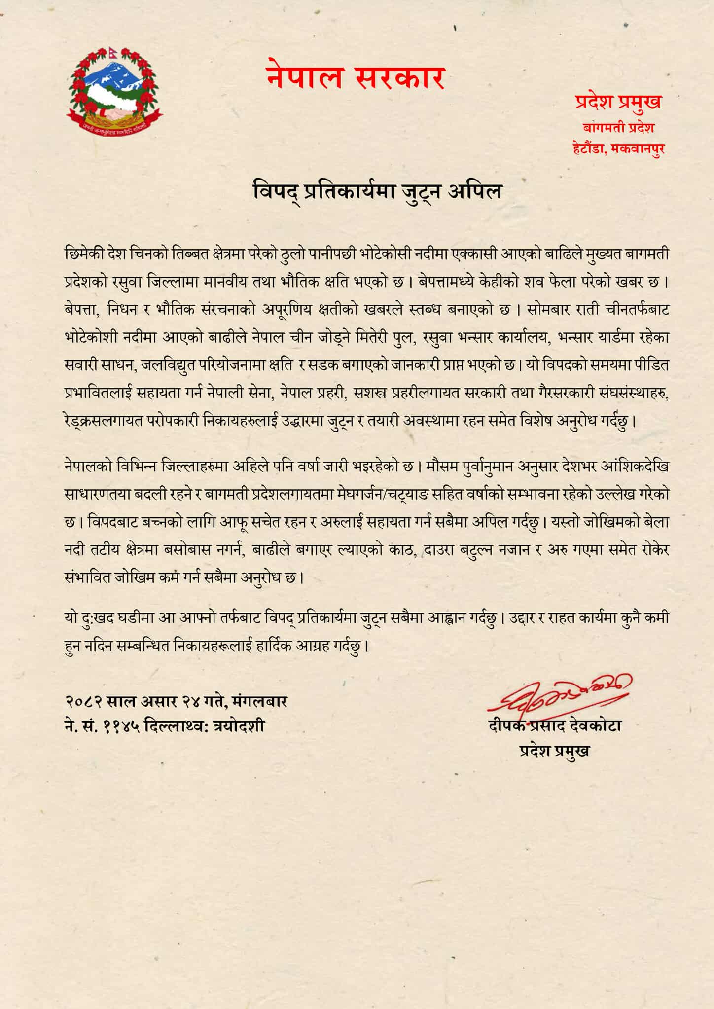 मौसम पुर्वानुमान अनुसार देशभर आंशिकदेखि साधारणतया बदली रहने र बागमती प्रदेशलगायतमा मेघगर्जन/चट्याङ सहित वर्षाको सम्भावना रहेको उल्लेख गरेको छ । विपदबाट बच्नको लागि आफू सचेत रहन र अरुलाई सहायता गर्न सबैमा उहाँले अनुरोध गर्नु भएको हो । यस्तो जोखिमको बेला नदी तटीय क्षेत्रमा बसोबास नगर्न, बाढीले बगाएर ल्याएको काठ, दाउरा बटुल्न नजान र अरु गएमा समेत रोकेर संभावित जोखिम कम गर्न सबैमा अनुरोध छ । ‘यो दु:खद घडीमा आ आफ्नो तर्फबाट विपत् प्रतिकार्यमा जुट्न सबैमा आह्वान गर्दछु । उद्दार र राहत कार्यमा कुनै कमी हुन नदिन सम्बन्धित निकायहरूलाई हार्दिक आग्रह गर्दछु’ उहाँले भन्नु भएको छ ।