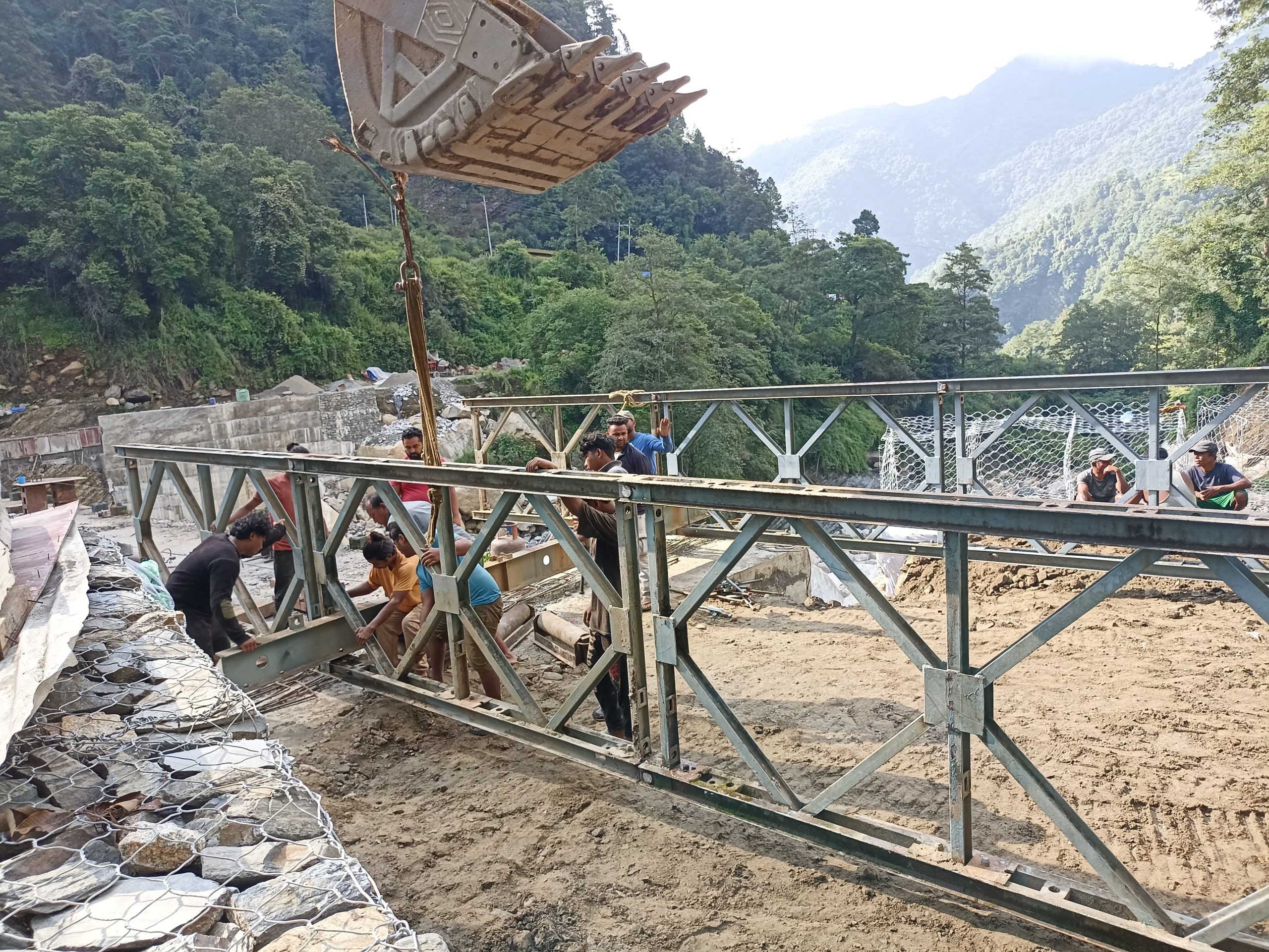 गत असोज १० देखि १२ गतेसम्म परेको अविरल वर्षासँगै आएको बाढीपहिरोले क्षतिग्रस्त कुलेखानी जलविद्युत् आयोजनाको ड्याममुनिको सिमखोलामा बेलिब्रिज जडान कार्य तीव्र बनाइएको हो । वर्षा अघि नै सञ्चालनको योजना बनाइएको उक्त बेलिब्रिज पूर्वतयारीका काम गर्न केही ढिलाई भएपनि साउन अगावै काम सक्ने तयारी रहेको छ । दक्ष जनशक्ति र आवश्यक उपकरण प्रयोग गरेर बेलिब्रिज जडानको काम भइरहेको जनाएको छ ।