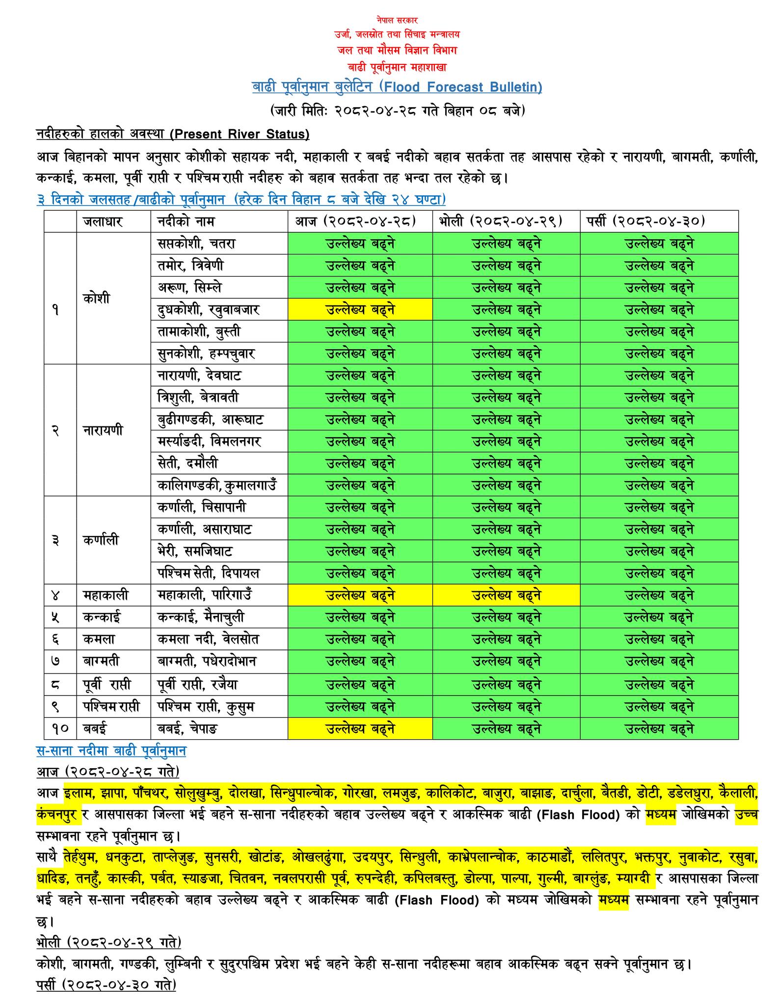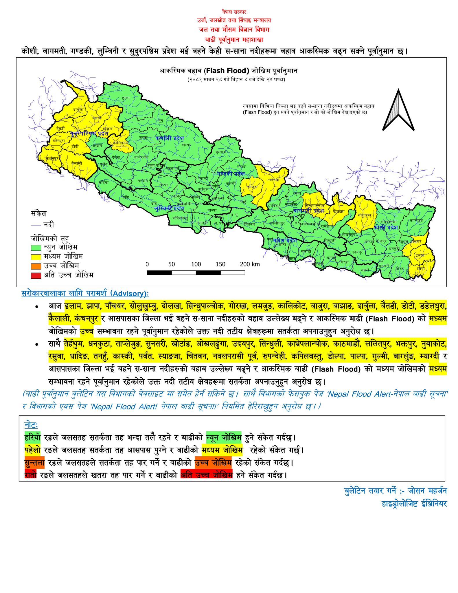 बुधबार इलाम, झापा, पाँचथर, सोलुखुम्बु, दोलखा, सिन्धुपाल्चोक, गोरखा, लमजुङ, कालिकोट, बाजुरा, बझाङ, दार्चुला, बैतडी, डोटी, डडेलधुरा, कैलाली, कञ्चनपुर र आसपासका जिल्ला भई बहने स-साना नदीहरूको बहाव उल्लेख्य बढ्ने र आकस्मिक बाढीको मध्यम जोखिमको उच्च सम्भावना रहने पूर्वानुमान छ ।