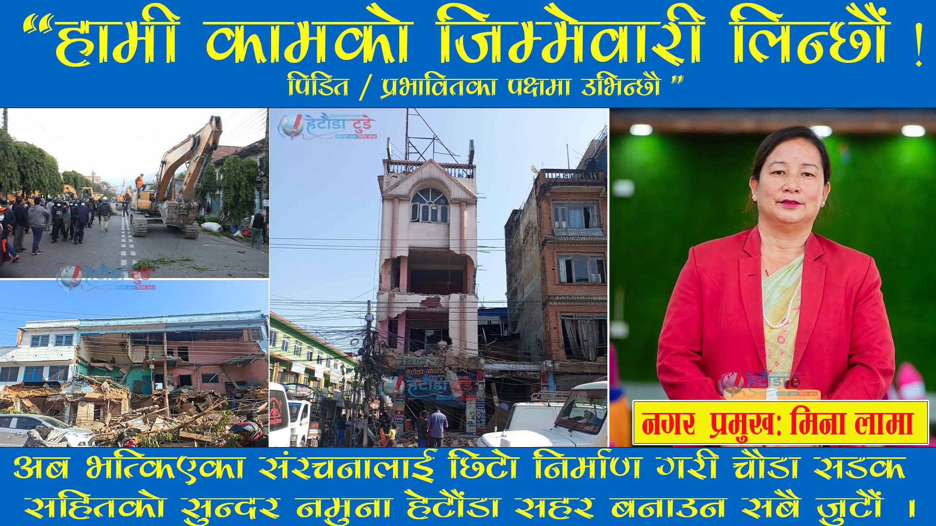हेटौडा । मंसिर ५ गते सडक डिभिजन हेटौंडाबाट २५/२५ गज भित्र पर्ने संरचना हटाउन सूचना जारी भएको दिनदेखि नै पीडितलाई क्षतिपूर्ति दिलाउन आफू संघीय निकायमा दौडधुपमा लागेको हेटौंडा उपमहानगरपालिका प्रमुख मीना कुमारी लामाले दाबी गरेकी छन्।
